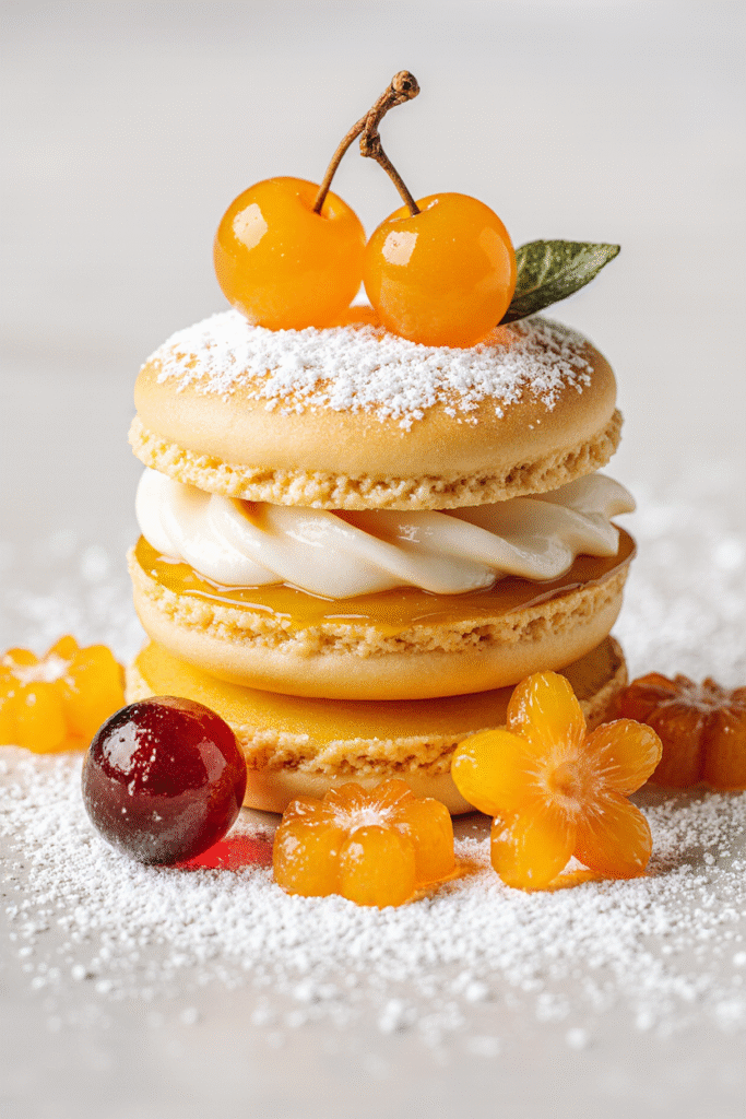 This elegant dessert combines the delicate crunch of French macarons with the vibrant flavors of citrus fruits. Layered with smooth whipped cream and a refreshing citrus curd, it creates a visually stunning stack thatβs both light and indulgent. The final touch β a dusting of powdered sugar, fresh mint leaves, and glossy cherries β makes it picture-perfect for any dessert table.