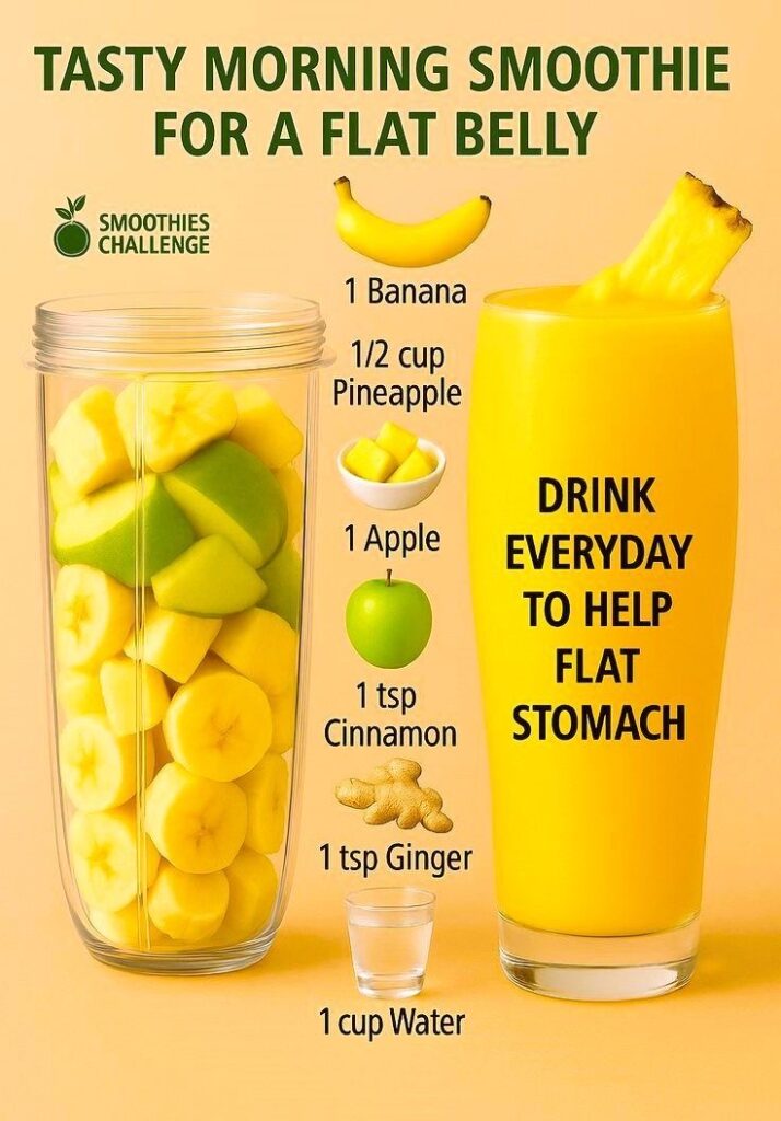 Start your day with this refreshing Flat Belly Morning Smoothie — a tropical detox blend made with banana, pineapple, apple, cinnamon, and ginger. This healthy smoothie helps reduce bloating, improve digestion, and support fat-burning naturally. Perfect for breakfast or post-workout, it’s packed with vitamins, fiber, and metabolism-boosting ingredients that keep your belly flat and energy levels high all day.