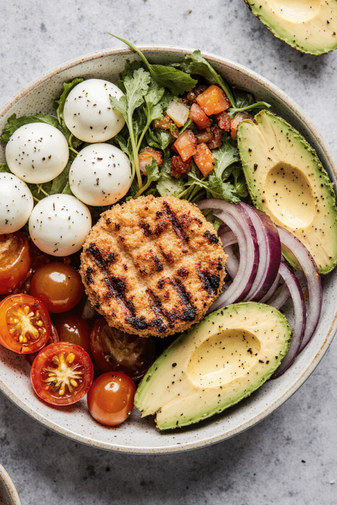 Grilled Chicken Burger Salad Bowl with Avocado & Mozzarella – Fresh, Juicy & Protein-Packed