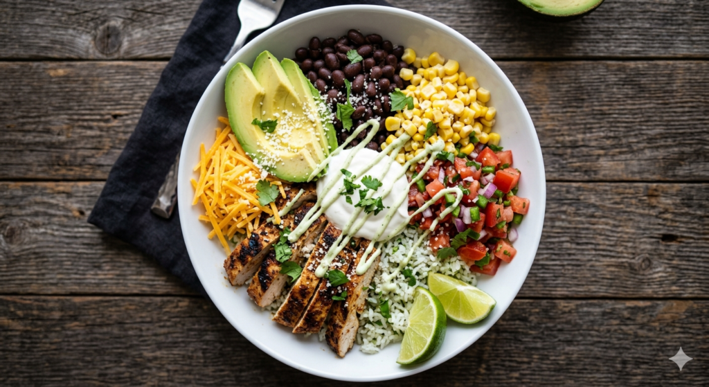 Introduction (you can adapt in your own words) This loaded chicken burrito bowl is a fresh, colorful and satisfying meal inspired by Mexican flavors and loved all over the United States. Tender marinated chicken, fluffy cilantro lime rice, black beans, corn, pico de gallo and creamy avocado come together in one bowl for a complete, balanced dinner. It’s perfect for meal prep, busy weeknights, or a build-your-own-bowl family night.